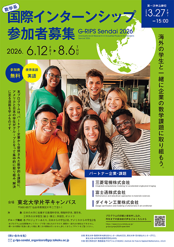 数学系の大学院生が企業現場の課題に日米混成チームで取り組む国際インターンシッププログラムです。UCLAのIPAM (Institute for Pure and Applied Mathematics) との協力によって日本では東北大学で2018年から開催しています。数学が企業の現場でどのように活用されているのかを知る機会となるとともに日本にいながら国際的な環境でのグループ活動を経験する場ともなっています。